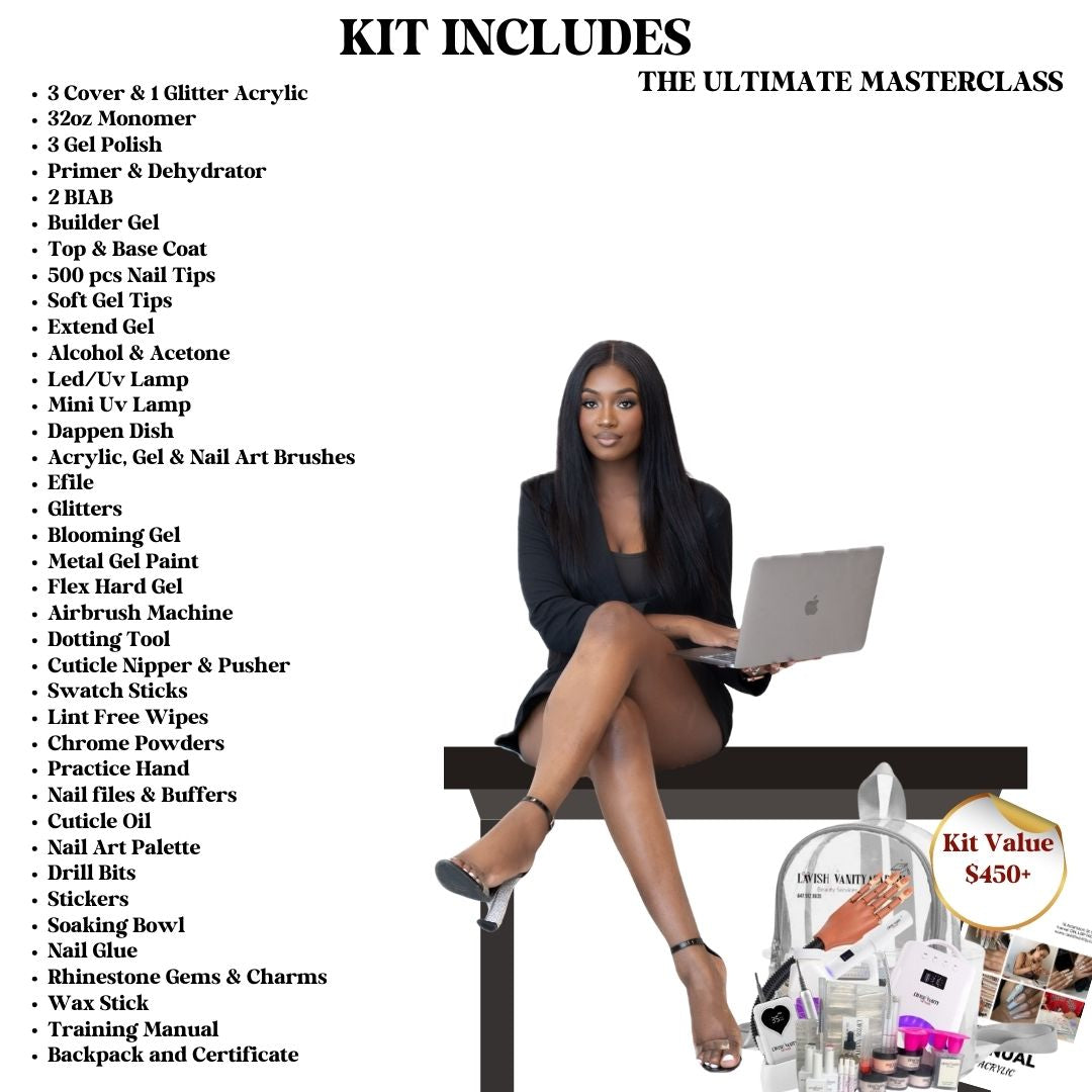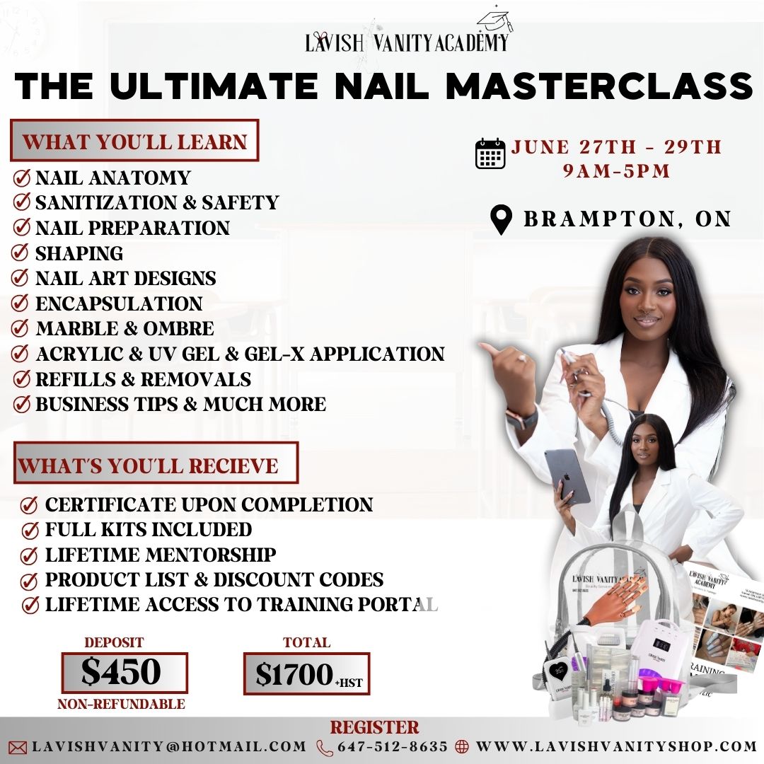 Our masterclass will cover everything, from sanitation, nail prep, nail anatomy, application, gel application, marbling, 3D art, nail form, ombré, bling, nail art and marketing NO EXPERIENCE NEEDED. We will teach you everything you need to know! After taking our course you will have EVERY THING YOU NEEDTO GET YOUR BUSINESS STARTED.
