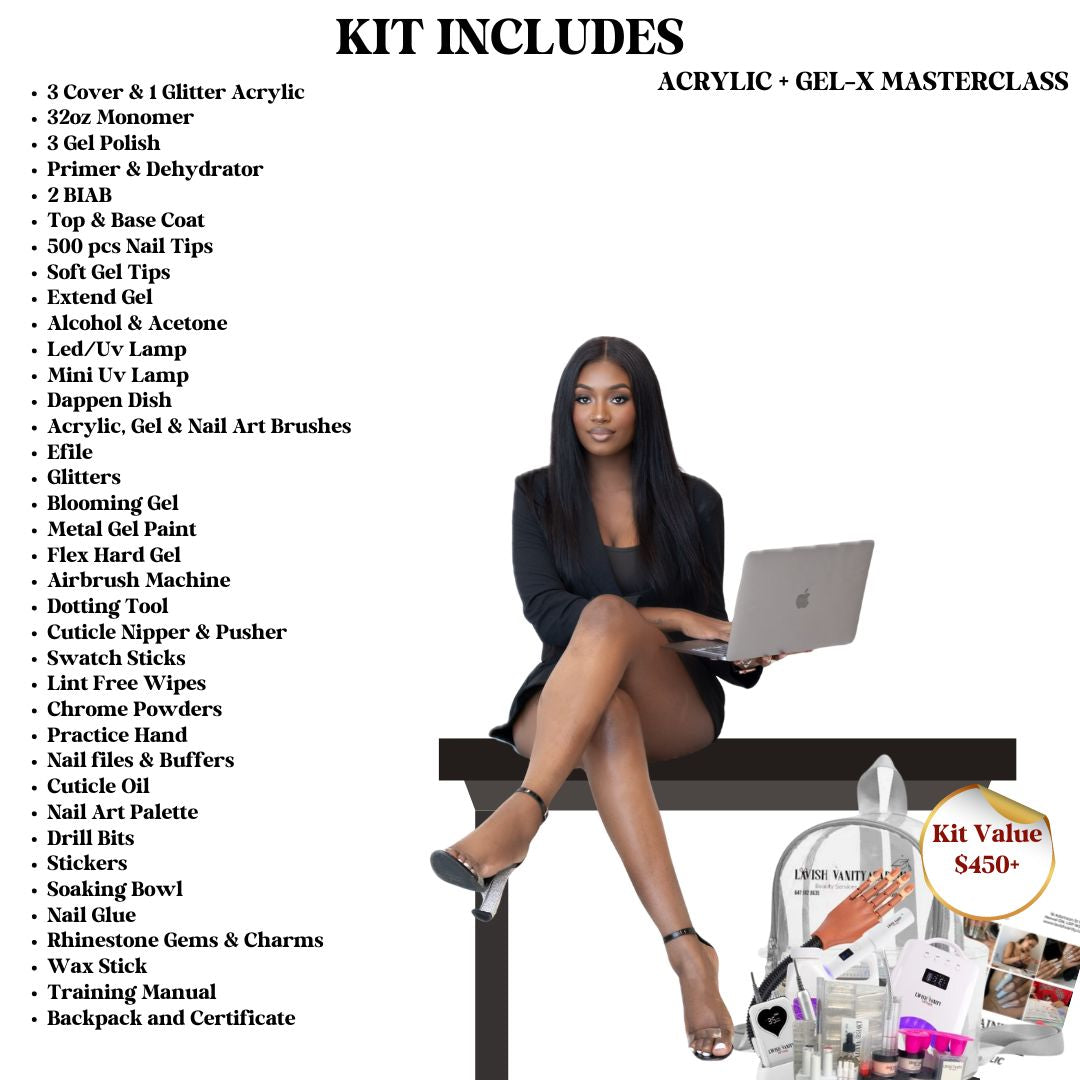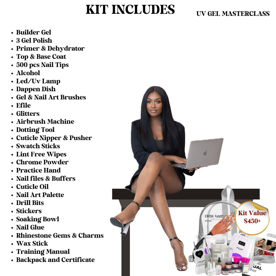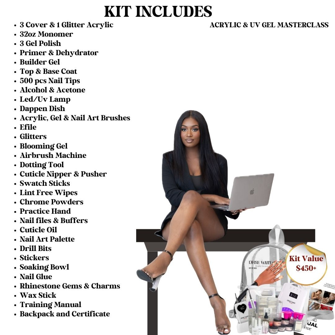 Picture this, you walk out of the training course and you're ready to start your business !!No more waiting for supplies, Acrylics, builder gel, nail drill, acetone, monomer and much more comes in your kit!!